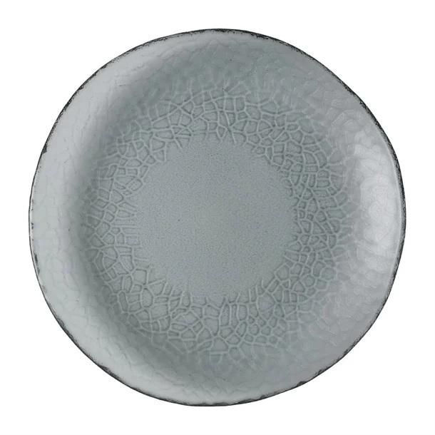 Part of Churchill China's Viana collection, these organic glass plates feature an embossed pattern inspired by traditional Córdoba patio tiles. The design is finished in a soft, muted 'Dusk' tone that adds a calm, understated elegance to the table. Their organic shape, with softly irregular edges, creates a more natural and fluid appearance that stands out from standard circular or symmetrical tableware.