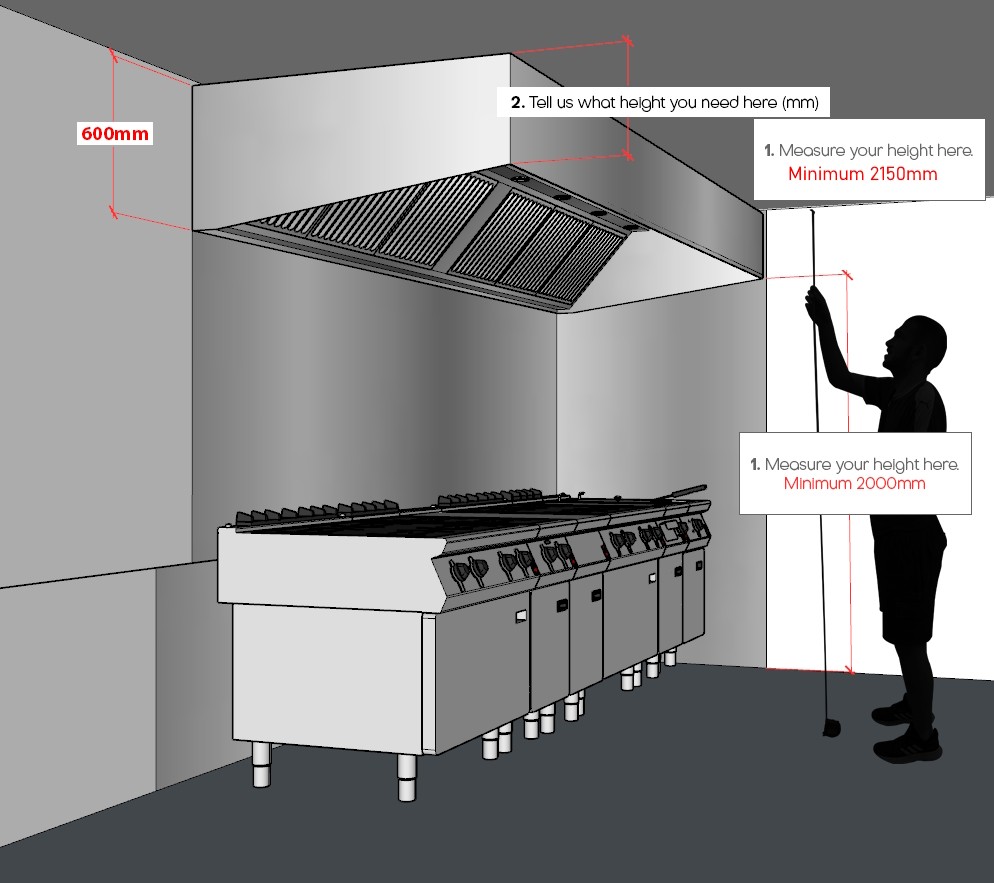 When choosing your depth consider the minimum requirement as per DW172 - you must have 300mm overhang to the front of the cookline. Measure the depth of your cooking appliances and consider space at the rear for plumbing. Our standard depth of 1200mm is suitable for most equipment. If you have a combi oven in the cookline we would specify a depth of 1400mm.